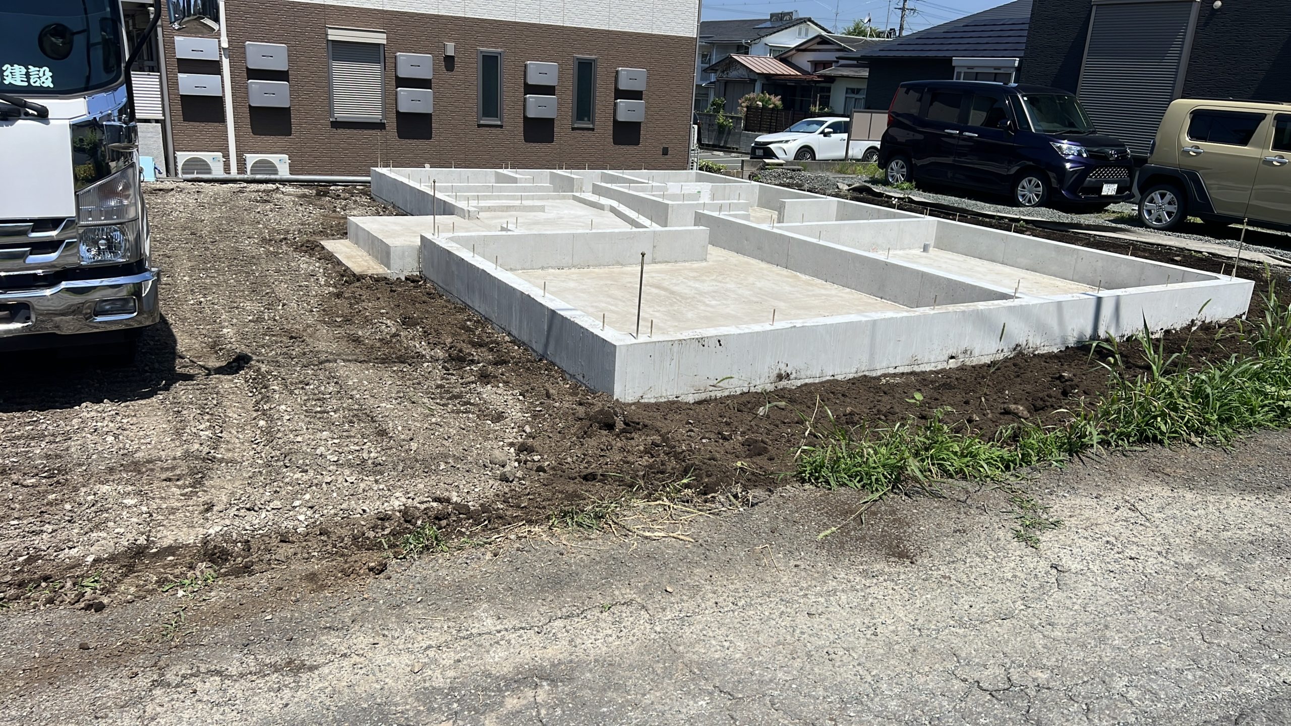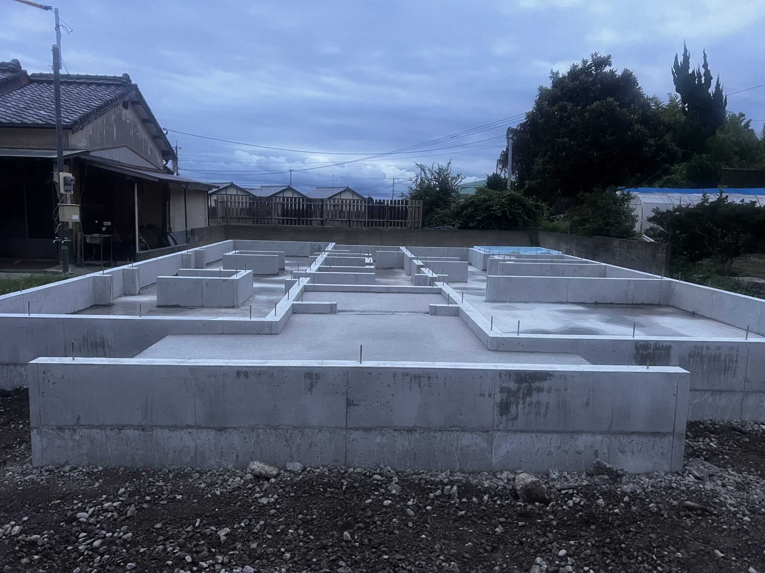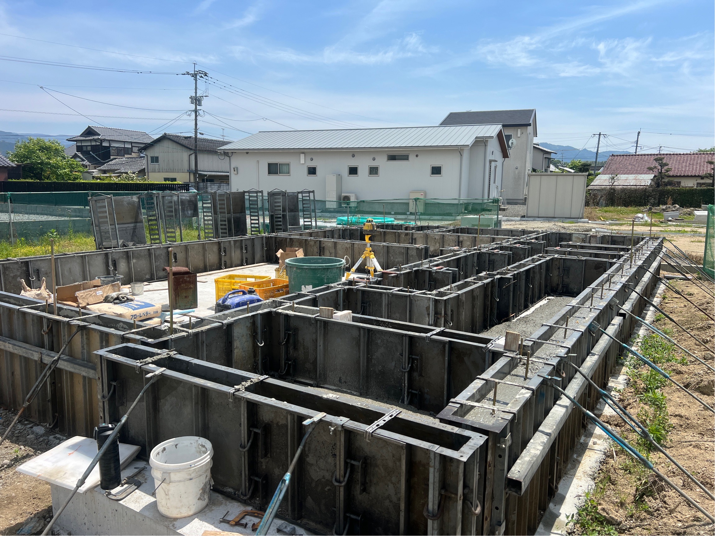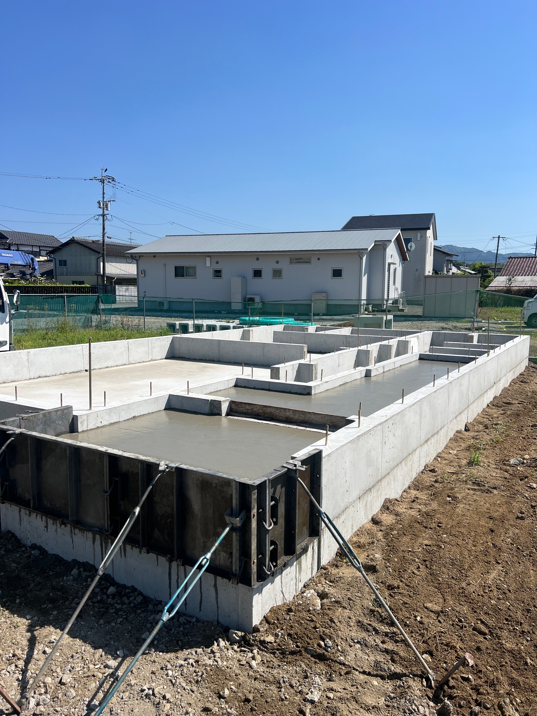 新規メーカー鬼丸ホーム様😊❗️立ち上がり状況です‼️段々日中は、暑くなり生コンの乾きが早くなってきてますこれからが大変な時期になりそうです😭